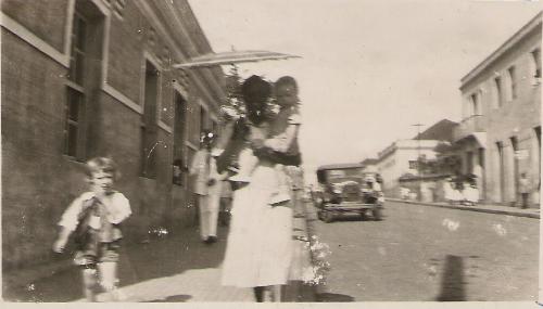 A senhora caminha pela rua Paraná, já próxima da esquina com a Cel. Baptista, levando um dos filhos ao colo e o outro ao lado. O prédio ao seu lado é onde funcionava o Hotel dos Viajantes. À direita, um "fordinho", único veículo naquele dia naquela que sempre foi a principal quadra da cidade. O prédio que se vê também à direita é aquele mesmo de que já foi falado: o primeiro sobrado construído no norte do Estado, hoje em parte descaracterizado pela alteração de sua fachada, principalmente pela retirada da sacada. Nos fundos a "Padaria e Confeitaria Paulista" que pertenceu a Plácio Bertozzi, que foi quem construiu o prédio. Mais adiante, encoberto pelo "fordinho" o prédio do Éden Theatro, também de propriedade de Plácido Bertozzi. ESTE FOTOLOG É ATUALIZADO TODO SÁBADO.