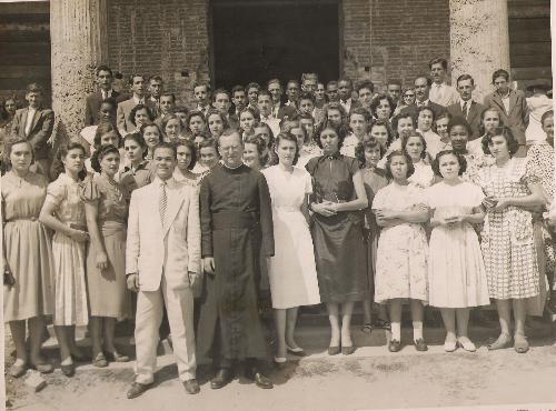 Em seus primeiros tempos de vida, o Coral D. Geraldo, que teve como seu primeiro regente o Padre Bruno Welter posa para uma foto histórica no ano de 1954, defronte à Catedral Diocesana, então ainda não concluída; Jacarezinho há muito tempo é conhecida como a cidade dos coráis mas isto se deve a alguns abnegados regentes, como o padre Bruno, que se vê na foto e Paulo Braga Diniz, além, é claro, de seus integrantes que sempre se dedicaram à música, valorizando a cultura desta cidade. A foto nos mostra pessoas que, além de sua vida profissional e particular, se empenharam pela divulgação da música em Jacarezinho e no Paraná. O Coral D. Geraldo, o primeiro que surgiu em Jacarezinho ainda hoje existe sob o comando de Paulo Braga Diniz e é um dos símbolos desta cidade. Identificamos alguns e convidamos os leitores a completarem a relação: na 1ª fila, ao lado do Pe. Bruno, Estácio Marques Freire, até hoje integrante do Coral. Lá atrás, à esquerda, Toninho Teixeira (com a cabeça algo erguida), já falecido, Antônio Pereira (que foi advogado e juiz, falecido), Eufrásio Cavazzani (um dos idealizadores do CAT) e Orestes de Oliveira (bancário e advogado). 50 anos separam esse momento dos dias de hoje (foto: acervo Maestro Paulo Braga Diniz).