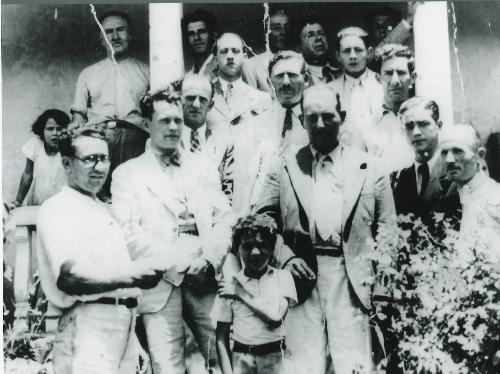 Esta foto bem registra os tempos tranqüilos que eram aqueles dos anos 40. Reunido, um grupo de amigos posa para a posteridade. Presentes, pessoas à época bastante conhecidas da cidade, muitas das quais acabaram por escrever páginas importantes na história de Jacarezinho. Identificados na 1ª fila externa, da direita para a esquerda: João Corso (comerciante), Zoroastro Cunha (industrial), Afonso Moreira (irmão de Benedito Moreira), Astolfo Leite (também irmão), João de Camargo (guarda-livros da Fazenda S. Vicente), Antonio Leite (padrastro de B. Moreira), João Piazza (comerciante e industrial), Ápio Madureira (comerciante) e uma criança (filha de José Epaminondas). Na 2ª fila, interna, e na mesma ordem: João dos Santos (gerente da Fazenda Iberá), José Tempesta (gerente da Fazenda S. Vicente), Antenor Rocha (cartorário), José Epaminondas Mugnani (mestre de obras), José de Almeida (comprador de café), Benedito Moreira (mais tarde prefeito) e um filho de José Epaminondas.
