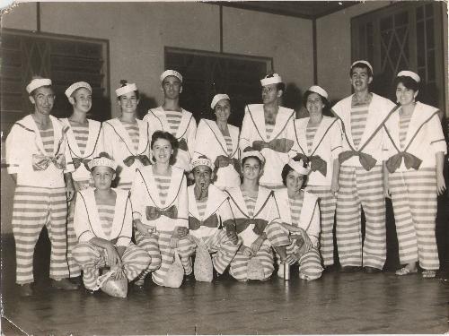 Meados da década de 50. O Jacarezinho Clube, com o seu primeiro e glamouroso salão recebe os foliões para mais uma noite animada de carnaval. À época era comum que grupos de amigos se unissem no que se chamava de "blocos de carnaval" e compareciam aos bailes do clube em que eram distribuídos prêmios para a fantasia mais bonita, a mais original e também o bloco mais animado. Esta foto, feita num dos cantos do salão, ao lado oposto da porta de entrada do clube, mostra um grupo de animados "foliões" fantasiados de marujo, posando para o fotógrafo que perpetuou aquele momento. Identificados na foto, dentre outros, Chic-Chic (Altino Gonçalves), pessoa muito conhecida e querida de Jacarezinho, já falecido. Ainda: Carlinhos Bertozzi, Nerecy Innocêncio, Leônidas Bertozzi Filho, Geraldo e Margot Silva e Mara Bertozzi. Bons tempos em que a fantasia tinha referência com alguma música do carnaval do ano e em que os instrumentos da alegria eram o confete, a serpentina e, claro, o lança-perfume.
