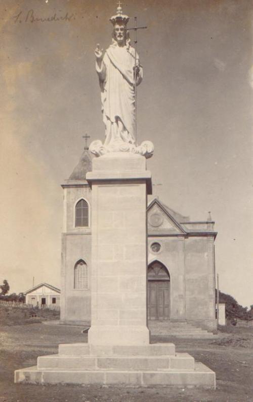 Esta foto mostra mais uma imagem da Igreja de São Benedicto, que tem uma histórica curiosa, já relatada aqui. Inicialmente, construída pelos antigos excravos, que não podiam freqüentar a Igreja dos brancos, ela aos poucos começou a merecer a atenção dos jacarezinhenses que passaram a participar das solenidades religiosas até que se convertesse realmente em uma igreja como tantas outras, sem nenhuma discriminação. Sua construção, demolição, reconstrução e recuperação demonstra uma luta das classes mais pobres em defesa de sua fé. A foto que aparece aqui é do início dos anos 40, tirada de um ângulo em que ao monumento ao santo aparece em primeiro plano, à frente da Igreja em uma pracinha até então ainda não urbanizada. Vê-se no fundo, à esquerda, uma das únicas residência que então existia naquele trecho da praça, então denominada de "Largo de São Benedicto".