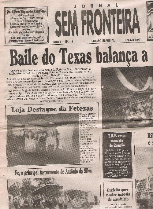 Circulando por aproximadamente dois anos o semanário Jornal Sem Fronteira, que tinha como sua Diretora Ivana Cunha Martins foi mais uma das muitas tentativas de manter um jornal essencilamnete local para Jacarezinho. A edição acima apresentada é do mês de julho de 1993, época do Baile do Texas que sempre movimentou muito a cidade e traz uma ampla cobertura do que foi a festa realizada no Ginásio Municipal.