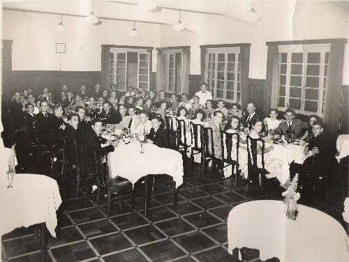 De um lado, à esquerda, alunos do C. Rei, quase todos de terno preto: Américo Brochado, Fernando Graumann, Ivan Chevalier, Olavo Puebla, Márcio Lemos, Chiquinho Moreira, Laércio Bertozzi e Melchior Bonilha. Do outro, à direita, alunos do Rui Barbosa: Nilton Vilela e Malaghini. As meninas, não consegui reconhecê-las. Mas na mesa dos fundos, a principal, professopres e dentre eles Padre Magno, Profª Jeny Lemos (de frente, sorrindo). À direita o engenheiro e professor de física Germano Leão Paciornik, perto dele o professor Tomaz Aimone, quase à frente deles o Prof. Renato Azzolini, na mesa à esquerda o professor de educação física e jogador da Esportiva Reynaldo Serra. O que se comemorava ali, não sei... Se alguém souber, informe... O local, era o glamouroso salão do Hotel Municipal, onde esse tipo de festiviade sempre se realizava (acervo: Sra. Violeta Cher, intermediação, Vereador Vicentinho).
