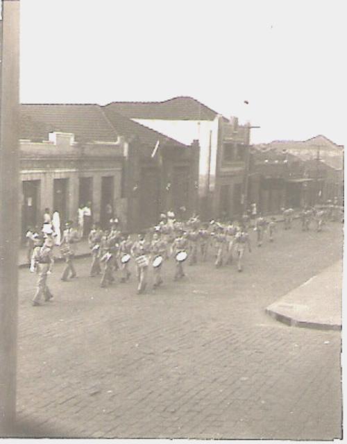 Já por várias vezes foi falado aqui que, graças aos desfiles escolares, tem sido possível reconstituir a história fotográfica dos prédios da rua Paraná, a que sempre foi a mais importante da cidade. Aqui, em foto de 1942 ou 43, alunos do Colégio Cristo Rei, com seu uniforme militarizado, sobem a rua Paraná, aproximando-se da esquina com a rua Cel. Alcântara. Interessante identificar os prédios à esquerda: o primeiro, com quatro portas de comércio é onde hoje se encontra a casa comercial de Feres João, o conhecido e estimadíssimo Miguelzinho. Esse imóvel que se vê na foto foi demolido nos anos 50, quando Miguelzinho ergueu seu bonito sobrado que ainda hoje ali se encontra. Descendo a rua, um prédio em que durante muitos anos funcionou um bar e na década de 50 ficou famoso como Bar, Restaurante e Bilhares Santo Antônio, do Sr. Castro e mais tarde do Sr. Ricardo Martoni, de quem já foi falado aqui. Descendo mais um pouco, a Farmácia Santa Terezinha, do Sr. Anésio de Almeida Leite e depois, outro prédio comercial onde já estaria funcionando a filial das Casas Pernambucanas, na época. Em seguida, a Loja Singer, que mais tarde foi desativada e no prédio foi instalada a Tipografia São José, inicialmente de Moises José Pedro e depois de Geraldo Silva e que só recentemente deixou de funcionar ali. Enfim, é uma foto pequena mas repleta de histórias de prédios da rua Paraná...