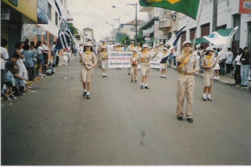 Meninos e meninas com idades entre 10 e 15 anos de diferentes classes sociais, cor, ou religião integravam um grupo denominado de "desbravadores". As reuniões eram uma vez por semana para aprender a desenvolver os talentos, habilidades, percepções e o gosto pela natureza. As atividades ao ar livre era um dos principais feitos, como acampar, caminhadas, escaladas, explorações nas matas e cavernas. Havia também o gosto pela cozinha ao ar livre, fazendo fogo sem fósforo. As habilidades eram demonstradas pela disciplina através de ordem unida, e a criatividade despertada pelas artes manuais. Combatia-se sempre o uso de fumo, álcool e drogas. O trabalho em equipe era valorizado para que fossem eles úteis à comunidade como prestar socorro em calamidades, tragédias, com participações ativas em campanhas comunitárias para ajudar pessoas carentes. Em tudo que faziam procurava-se desenvolver amor a Deus, à Pátria e, além disso, a muitos amigos. Oficialmente existe desde 1950 no Brasil, como um programa reconhecido da Igreja Adventista do 7° Dia. Essa foto de 1998, de Aparecido dos Santos Fragatti que foi seu diretor e a sua filha Denise dos Santos Fragatti, como vice-diretora, marca o desfile de Sete de Setembro na rua Paraná e que lamentavelmente esse foi o último ano dos desbravadores em Jacarezinho, pois foram encerradas as suas atividades. O grupo na época era composto de aproximadamente 38 jovens. (Intermediação e texto do vereador Vicentinho).