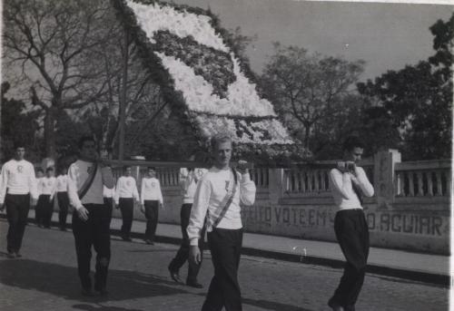 O desfile do dia 7 de Setembro sempre foi uma data muito comemorada em Jacarezinho. Mais ainda quando os valores cívicos eram respeitados e admirados. Os colégios se engalavam e punham seus alunos nas ruas, cada um procurando ser mais bonito e original do que os outros. O resultado era uma festa de cores e civismo para todos. Nesta foto desfila o Cristo Rei, tendo à sua frente, à esquerda, o aluno Américo Felício de Assis, mais tarde advogado, professor na Faculdade de Filosofia e Assessor Jurídico da Câmara Municipal, hoje aposentado. No muro a propaganda da candidatura a Prefeito de João de Aguiar (o que se deu em 1950) demonstra que o desfile foi em meados daquela década. (acervo: Luiz Paulo Larcher).