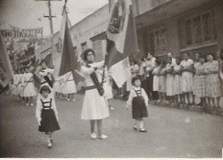 Aqui, outra imagem das alunas do Colégio Imaculada Conceição desfilando em 7 de setembro de 1960, com uma aluna já mais graduada, tendo ao lado duas pequenas escolares, portando a Bandeira do Paraná.