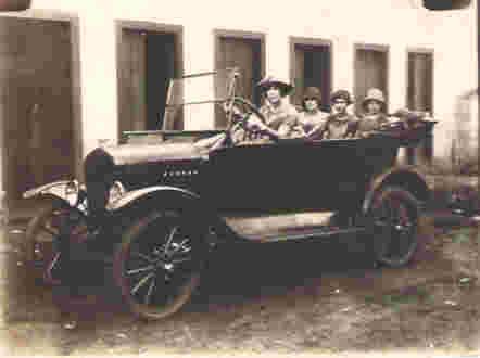 Possivelmente da década de 20 esta foto mostra um veículo, carinhosamente apelidado na época de "pé de bode" estacionado na rua Paraná, na 2ª quadra depois da praça Rui Barbosa. No volante, uma jovem senhorinha faz pose para o fotógrafo registrar a ocasião. No banco de traz três outras jovens observam o fotógrafo. Todas elas usam chapéu, traje típico das mulheres dos anos 20 e 30. Quem são?... Não foi possível identificá-las. (Acervo, Romilda de Souza).