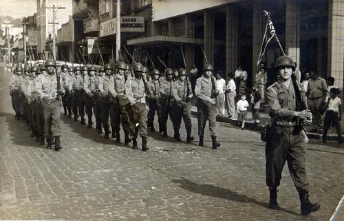 Esta foto, do ano de 1959, mostra o Tiro de Guerra passando defronte à Casa Setti cujo prédio novo acabara de ser inaugurado. É possível ver suas amplas galerias que ressaltavam a beleza do estabelecimento, com suas vitrines logo atrás delas. As vitrines serviam não só para exposição de artigos da empresa mas também para divulgação de eventos sociais e comunitários. (acervo, Cesar Stati).