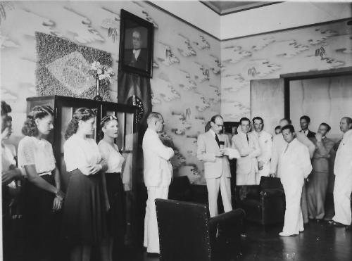Da primeira metade da década de 40 esta foto mostra o que possivelmente foi uma solenidade da sala da direção do Colégio Rui Barbosa. Discursa o então prefeito João de Aguiar (com uma tarja de luto em demonstrando da perda de um parente próximo, talvez seu pai o Cel. João Carlos de Aguiar) sob os olhares atentos de todos.