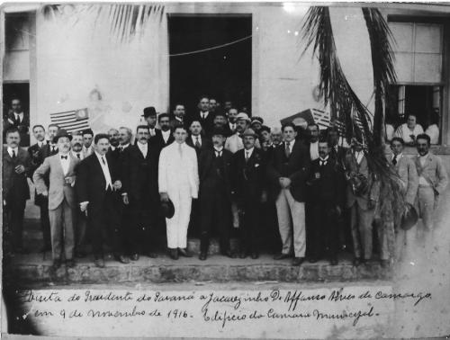 Nessa mesma visita do Presidente Affonso Camargo, aparece ele agora de pé, (é o 4º, da esquerda para a direita) novamente com as lideranças locais. Nesta foto já foi possível identificar outras pessoas e nela aparecem o Capitão Luiz Setti (o 1º da esquerda´para a direita) e logo ao seu lado o Dr. astolfo Baptista. Encostado na parede, sendo visível apenas a cabeça, o Coronel Cecílio Rocha que tem ao seu lado o Coronel Figueiredo.
