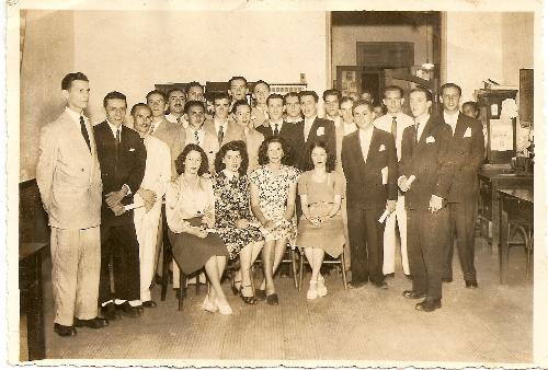 Ao que tudo indica esta foto tem estreita ligação com a anterior, mostrando os contabilistas (ou seriam contadorandos?...) da Escola Técnica de Comércio D. Fernando Tadei reunidos após a colação de grau. À época esse diploma era dos mais importantes, habilitando seus portadores a atuar na área contábil, então em franco desenvolvimento. A foto parece ter sido feita no prédio cuja fotografia foi publicada aqui no dia 2 de novembro, o sobrado da praça rui Barbosa, uma vez que essa escola funcionou durante seus primeiros tempos naquele local. Os alunos já estão, cada um, com o seu diploma nas mãos pelo que se conclui que a foto foi feita depois da formatura. Da escola, saíram eles para o jantar no Hotel Paulista, na mesma quadra a poucos metros dali. (Esta foto pertence ao acervo de Benedito Moreira e nos foi cedida por sua filha Sandra Moreira Souza).