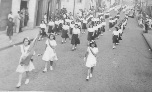 Mais uma vez um desfile escolar é utilizado para mostrar a rua Paraná de antigamente. Enquanto os alunos de então Ginásio Rui Barbosa passam pela rua, observa-se os prédios à direita, principalmente o da esquina, antes de atravessar a rua. Trata-se do Bar do Norte onde os jacarezinhenses se reuniam para saber dos acontecimentos locais e nacionais e que foi o lugar do encontro de todos quando do término da 2ª guerra mundial, conforme foto publicada aqui no dia 12 de outubro de 2004. Atravessando a rua, o imóvel que serviu de sede para o Banestado (mais tarde demolido mas é o mesmo lugar em que se encontra hoje o Banco Itaú). À direita, vê-se as portas da Casa Setti (Acervo: José Augusto Enz, intermediado pelo vereador Vicentinho).