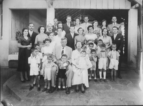 Por volta de 1913 João Ribeiro de Araújo veio para Jacarezinho e aqui constituiu numerosa família. Residindo na avenida Manoel Ribas (onde foi feita esta foto em casa ainda hoje existente sem transformação alguma) numa manhã dos anos 50 reuniu sua família para registrar a união que entre todos havia: esposa, filhos, genros, noras e netos numa bela manhã de domingo participaram da felicidade e alegria do casal. Filhos de João Ribeiro de Araújo: Jarbas, João, Mozart, Lucinda, Geny, Zilá, Armênia, Pedro, Alberto, Elza e Maria. Ainda hoje muitos de seus descendentes residem em Jacarezinho (acervo Famílias: Araújo & Almeida Leite).