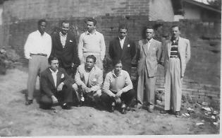 Possivelmente do final dos anos 40 ou início da década de 50, esta foto registra um dia de confraternização na residência de Alberto Foggiato Filho, dos funcionários administrativos da Prefeitura Municipal naquela época. São eles, da esquerda para a direita, de pé: Agenor, Orlando de George, Muca, José Cher, Antônio Fernandes e Foggiato. Agachados: Jofre Elias, Amarelinho e Telmo Moreira. Desse grupo, Agenor, Muca e Amarelinho foram grandes nomes da Esportiva como seus jogadores. Jofre foi talvez o maior de seus dirigentes. José Cher também foi dirigente da Esportiva, A Prefeitura, na verdade, era uma maneira de reter os grandes jogadores na cidade. Jofre e Foggiato foram grandes nomes da cultura desta cidade, notadamente no CAT. (Acervo, Augusto Foggiato).
