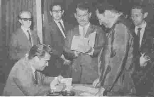 Em 26 de outubro de 1969, em memorável Noite de Autógrafos, o Professor Rodrigo Octávio Torres Pereira (sentado, fal.) lançou seu livro de poesias "Terra da Vida, do Amor e da Morte da Gente" em uma festividade que marcou época na sociedade e nos meios culturais desta cidade. Nesta foto, além do autor, estão, da esquerda para a direita, o notável professor de música Renato Azzolini (fal.), o então Juiz de Direito da Comarca Darcy Nasser de Mello (mais tarde Desembargador no Tribunal de Justiça do Paraná, hoje aposentado), Prof. Silvestre Marques (que viria a ser diretor da Faculdade de Filosofia - fal.), Octácilio Medeiros de Souza (contador e mais tarde advogado - fal.) e Ulysses Silva Costa (contador, fal.).