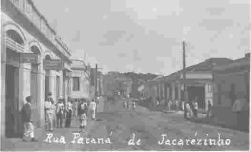 O chão da rua era de terra sem nem mesmo calçamento. Os postes sem lâmpadas indicam que não havia ainda iluminação pública. Aliás, pela ausência de outros postes nesta rua, observa-se que a rede elétrica existia apenas até essa esquina. E moradores em número razoável, andando pela rua bem no coração da cidade, já naquela época. Vários fatores conduziram esta esquina para ser eleita tacitamente como a mais importante da cidade ao longo dos tempos: um bar freqüentado por políticos e intelectuais, a sede de um jornal, uma importante farmácia, o único hotel da cidade, a agência de um banco e a maior casa comercial de então. Tudo isto contribuiu para que o jacarezinhense tornasse esse ponto o mais freqüentado por ele, situação que decorridos tantos anos, ainda hoje se verifica. (Acervo: Fernando Brochado).