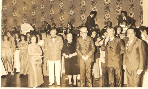 Com a orquestra aos fundos o casal Izabel e Anésio de Almeida Leite (ao centro) recebe as homenagens daquela entidade social, então dirigida por um de seus maiores presidentes, Antenor Rocha (o 1º da direita para a esquerda). Fala em nome da diretoria do clube o radialista Silvestre Marques (entre Antenor e Anésio), tendo ao lado de dª Izabel o consagrado cantor Francisco Petrônio que corria o Brasil com o seu famoso "baile da saudade". (Acervo: Família Almeida Leite).