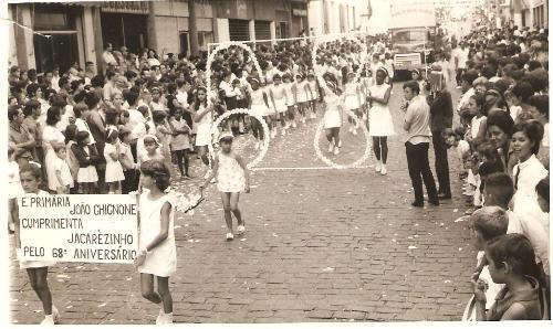 No dia 2 de abril, como sempre acontecia e acontece, Jacarezinho comemorou festivamente o seu aniversário de emancipação política. Pela rua Paraná as escolas desfilavam garbosamente mostrando o orgulho de seus alunos de serem jacarezinhenses. E dentre essas, a Escola Primária João Ghignone, hoje desativada, que trouxe seus alunos para aquele momento cívico. A foto foi feita defronte ao prédio do Consórcio, ainda com o andar térreo inacabado embora com o cinema já em funcionamento. 40 anos se passaram desde então. (Acervo: Escola Padre Magno; intermediação vereador Vicentinho).