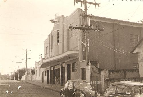Esta é mais uma imagem do Cine Éden, feita por volta do início da década de 70, quando a rua Santos Dumont, onde ele se localizava, ainda não era asfaltada. É possível ver que o cinema ostentava sua denominação em dois pontos diferentes do prédio: bem no alto, em letras negras e acima da marquise, coloridas. Hoje esse prédio, inteiramente preservado, abriga um supermercado. Observa-se na sequência da foto a casa em que seu proprietário Plácido Bertozzi, residia. E quase do lado esquerdo da foto, é visível o antigo relógio que fora instalado na praça pelo Rotary Club.
