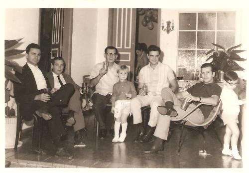 Provavelmente de meados da década de 60 esta foto nos remete a um costume então muito em voga naquela época: as reuniões que se realizavam nas residências e que aqui parece ser aniversário de alguma criança, as bexigas que se vê pela porta dão essa indicação. Aqui, da esquerda para a direita, o empresário Miguel Afonso, o médico Antônio Garbelini (fal.), (?), o médico Emmanuel Gonçalves Vieira e seu cunhado. Emmanuel mais tarde foi por duas vezes prefeito desta cidade. As crianças não foram identificadas, sendo provavelmente filhas de algum dos que aparecem na foto. (Acervo: Miguelito Afonso).