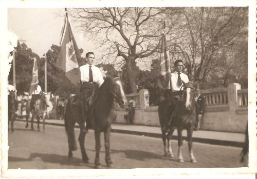 Em foto do dia 7 de setembro de 1956 os alunos do Colégio Cristo Rei desfilando na data cívica com os porta-bandeiras a cavalo. Aliás, desde os primeiros tempos o Cristo Rei, em razão de seu sistema militarizado adotava a prática de desfile com alunos montados em cavalo. Descem eles a rua Paraná, logo após passarem pela avenida Manoel Ribas.
