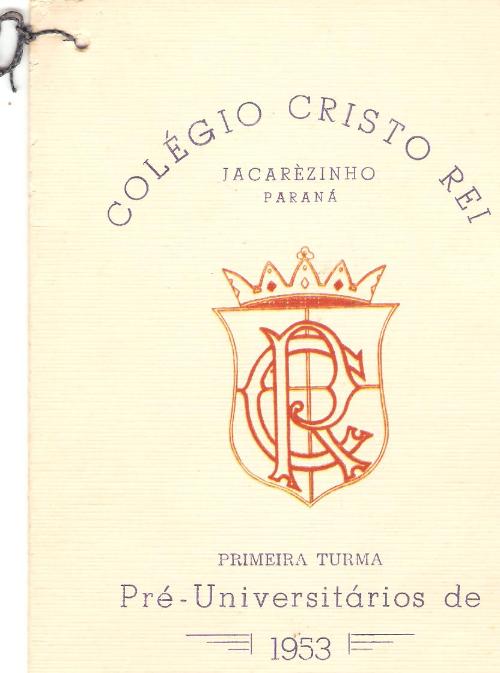 Capa de convite de formatura de conclusão do Curso Científico do Colégio Cristo Rei, do ano de 1953. O colégio implantara em 1951 o curso científico, uma das modalidades de acesso ao vestibular, e os formandos daquele ano orgulhosamente se auto-denominaram de "Primeira Turma de Pré-Universitários". É que eles tinham certeza de que estavam já às portas do curso superior, graças à qualidade do ensino do Cristo Rei tanto que pouco mais de 30 dias depois da conclusão do curso quase todos eles já tinham sido aprovados em faculdades integrantes das melhores universidades do Brasil: Federal do Paraná e USP.