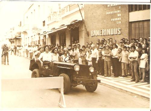 A rua Paraná sempre foi palco de grandes comemorações, as mais tradicionais o 2 de abril (Aniversário da Cidade) e o 7 de setembro (Independência do Brasil). Aqui já foram expostas inúmeras fotos. Essa provavelmente indica que é o Dia da Independência. Aqui podemos ver o prédio do Banco Mercantil e Industrial do Paraná S/A (Bamerindus) que tinha à época um recuo, além da calçada, proporcionando o aglomerado de pessoas que acompanhavam o desfile, entre as quais: o ex prefeito Chiquinho Cersósimo, com seu filho Ricardo, ao lado Walter Schuminski e no jeep, o Rugerinho, também filho do Chiquinho e a sua frente o Carlos Eduardo Loureiro Bottas (Carlinhos). Ao lado do banco, o Bar do Jorge (Georges Wadih Jaouiche) comerciante muito estimado à época e seguindo o Bar e Restaurante Canta Galo, famoso pelas costeladas às sexta-feiras e do jogo de dado. A foto da década de 70 é do acervo de Geny Felix; intermediação e texto de Vicente Estanislau Ribeiro (Vicentinho).
