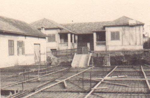 Em imagem dos anos 50 vê-se obras iniciais da construção do piso da quadra de esportes do Colégio Cristo Rei e que existe até hoje. Nos fundos da foto o prédio do primário, já concluído, e que foi erguido em meados da década de 40 após um incêndio ter consumido o antigo que fora construída de madeira.