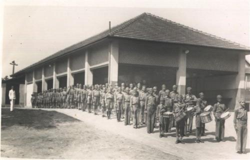 Desde a sua construção o Cristo Rei teve o galpão que se vê nesta imagem. Ali eram realizadas reuniões mas principalmente solenidades, o que perdurou até 1952 quando se inaugurou sua ala nova com o salão nobre ainda hoje existente. O galpão foi então demolido, ampliando-se o pátio para os alunos mas ele registra uma época bonita da história do colégio. Na foto, alunos perfilados com seu uniforme militarizado (a imagem deve ser anterior ao ano de 1949, quando o uniforme mudou) preparam-se para um desfile.