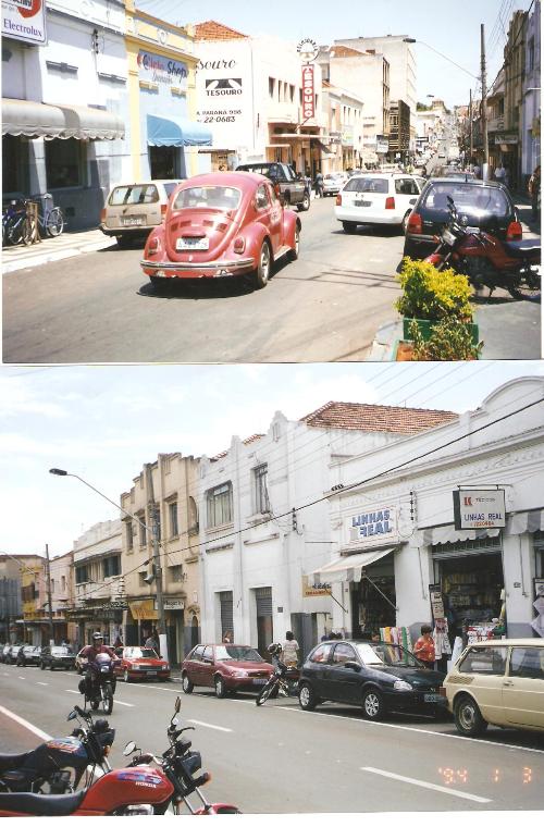 Duas imagens da primeira quadra da rua Paraná, depois da praça. A do alto, mais antiga, é do tempo em que só era permitido o tráfego de veículos para o alto. A segunda, mais recente, já se nota a inversão da mão de direção. Da primeira, lado esquerdo de quem sobe a rua Paraná, muita alteração houve nos prédios embora alguns ainda poreservados principalmente o 1º, onde se vê o luminoso da Relojoaria Tesouro. É um prédio de quase 70 anos. Na foto de baixo a preservação quase total de seus prédios, tendo só o primeiro sofrido modificação, nesta foto já visível. Todos os outros têm mais de 65 anos e se encontram intactos.