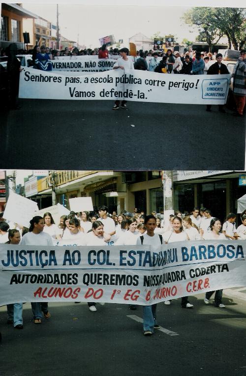 O jacarezinhense, como o brasileiro de um modo geral, é um povo pacato e ordeiro. Mas que sabe protestar e reivindicar, quando isto se torna necessário. Nesta página duas imagens de momentos de protestos realizados pelo centro da cidade nos anos 90.