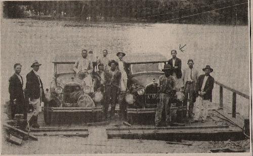 Esta é uma foto de rara importância pois mostra alguns dos pioneiros atravessando o rio Paranapanema, de Ourinhos, Estado de São Paulo, para Jacarezinho, no Paraná. O meio utilizado, pela inexistência de ponte, era a balsa que aqui, além dos passageiros, transporta também dois veículos da época. A foto é da década de trinta.