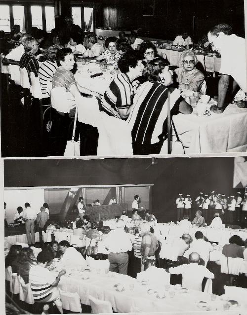 Em 1989, por iniciativa do então prefeito Adhemar Setti reuniram-se em Jacarezinho, entre moradores e ex-moradores da cidade, mais de 300 pessoas. Foi uma festa de congraçamento e que marcou o reencontro de muitos amigos. Na foto ao alto o prefeito, em pé, conversa com ex-moradores durante o café da manhã que marcou a recepção a todos. Na foto inferior, a Banda Salvador Ambrósio abrilhanta a festividade.