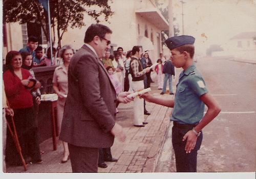 No dia 29 de abril de 2005, consta aqui no fotoblog um registro histórico dessa maravilhosa instituição que hoje já não mais existe nos moldes que foi implantada, com grande importância como função social na comunidade, retirando os jovens (14 a 18) anos de muitas coisas ruins e dando oportunidade de trabalho, disciplina e civismo, uma permanente aula de cidadania a esses adolescentes, em sua maioria advinda de famílias menos favorecidas. A foto do ano de 81 mostra a solenidade de graduação de cabos e sargentos mirins defronte ao Centro Espírita Ana Marossi “Lar das Crianças”, cuja presidenta de ambas as instituições na época era a Sra. Aparecida Tempesta, instrutor militar cabo Cassiano e o paraninfo dessa turma foi o Dr. Nilton Gren (representando a Secretaria Estadual do Governo) que faz a entrega do certificado de conclusão ao aluno mirim Adalberto Pereira da Silva que foi graduado como cabo. (Acervo fotográfico do graduado, intermediação e texto de Vicente Estanislau Ribeiro, Vicentinho).