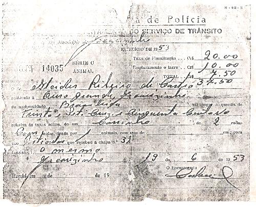 Embora a reprodução acima não seja de boa qualidade, ela se reveste de importância uma vez que registra um fato desconhecido da maioria das pessoas: é que durante muito tempo as carrocinhas que trafegavam pelas ruas e estradas além de pagar imposto junto ao DST - Departamento do Serviço de Trânsito, então um órgão das Delegacias de Polícia, recebiam ainda uma placa que por sua vez era lacrada!... Sem isso, não se podia circular... O recibo que se vê é de Jacarezinho, do ano de 1953, de um proprietário rural do Bairro Ouro Grande, à época talvez o mais populoso do município.(Acervo documental do Vereador Wilson Ferreira).