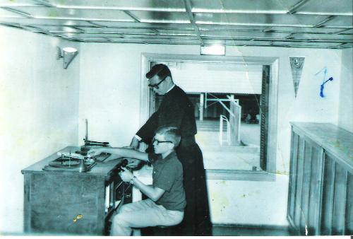 Em imagem dos anos sessenta o então "contra-regra" (hoje, DJ) Levi Ribeiro de Moraes faz tocar os discos de vinil tendo ao seu lado o Frater Ginaldo. A curiosidade da foto é que se tem a impressão que ao lado encontra-se uma janela quando na verdade trata-se de uma foto de parte da quadra do Colégio Cristo Rei. (Acervo, Levi Ribeiro de Moraes).