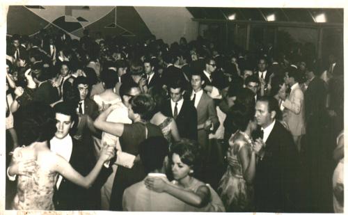 Em imagem dos anos sessenta feita nos salões do Jacarezinho Clube é possível perceber a elegância dos jovens daquela época: os moços de terno e gravata, quase sempre de terno escuro e as moças trajando vestidos sociais. (Acervo, Walter Dolens Rosa, "Frangão")