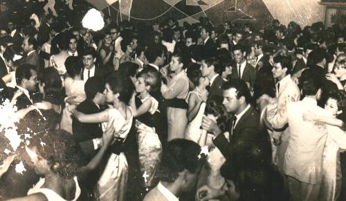 Possivelmente da mesma data da foto publicada no dia 21 deste mês, vê-se jovens dos anos sessenta, em trajes da época, animadamente dançando em um baile nos salões do Jacarezinho Clube. (Acervo: Walter Dolens Rosa, Frangão).