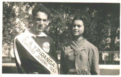 Em flagrante de 1957 o jacarezinhense Luiz Liberto, por todos conhecido como Belo e estimadíssimo na cidade, posa ao lado de uma bela senhorita da época. Era o momento em que o time de futebol por ele treinado, juvenil do Ypiranga, sagrara-se campeão. Embora a foto seja de esportes vale porém pelo registro de uma bonita representante da sociedade jacarezinhense.