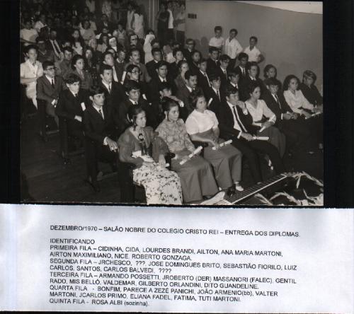 Na formatura dos contadores de 1970 realizada no salão nobre do Colégio Cristo Rei, os concluintes do curso preparam-se para a colação de grau. São eles: