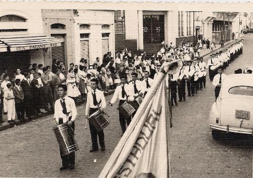 Em dia de civismo desfila pela rua Paraná em 7 de setembro de 1957 o Colégio Estadual Rui Barbosa. Por essa foto é possível perceber a grande transformação que em pouco mais de 50 anos esse trecho sofreu no que diz respeito a seus prédio. À exceção do prédio do chamado Edifício Consórcio, então em fase de construção, todos os demais foram derrubados e outros mais foram erguidos em seu lugar. A se lamentar o do Banestado, hoje substituído por um outro, sem linha arquitetônica alguma e que serve à agência do Banco Itaú. (Acervo, Família do Sr. Luiz Ferreira., Intermediação, Lorival Possetti).