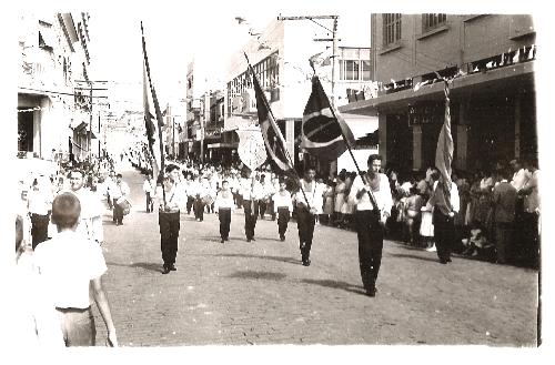 A imagem acima mostra o Colégio Cristo Rei desfilando pela rua Paraná num dia 7 de Setembro de um ano da década de sessenta. Os prédios à direita praticamente são os mesmos, a Casa Setti já havia inaugurado seu novo edifício onde hoje se encontra o Magazine Luíza. À esquerda ainda é possível ver-se uma parte do prédio do Banestado, derrubado numa das maiores agressões arquitetônicas da história desta cidade.