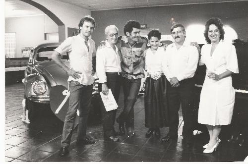 Por volta do final dos anos 80, artistas jacarezinhenses fizeram um encontro na antiga revenda Volkswagem de Jacarezinho, então de propriedade da empresa Gentil Veículos Ltda. Da esquerda para a direita Luizinho Botelho (fotógrafo), Quincaju (escultor), Joãozinho Caldeira (escultor), ???, Paulo Braga Diniz (músico) e Dione Gentil (escritora. (acervo de Luiz Botelho Filho).