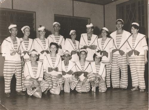 Em foto feita em meados dos anos 50, no salão antigo do Jacarezinho Clube, um grupo de jovens, organizados em um bloco carnavalesco denominado de 'marujos" posa para o fotógrafo emm um intervalo da folia. Identificados, dentre outros, em pé, da esquerda para a direita, Chic-Chic, Carlinhos Bertozzi, Nerecy Inocêncio e os dois últimos Geraldo Silva e Margô. Agachado, apenas a seguda, Mara. (acervo, Mara Bertozzi de Oliveira).