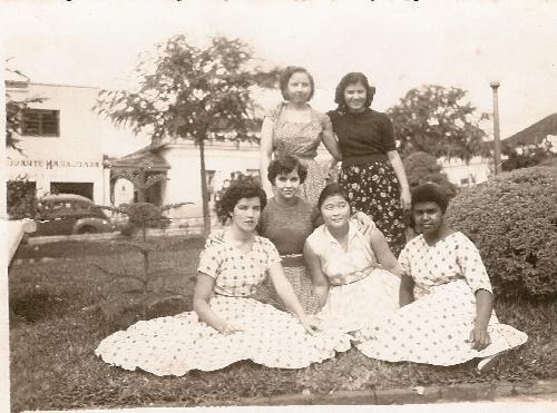 O momento da confraternização delas ficou registrado ali mesmo na praça, do ângulo que faz sentido a rua Paraná, onde se vê o prédio do antigo Bar e Restaurante Marajoara e ao lado o estabelecimento do Benedito Mendonça. A primeira jovem sentada da esquerda para a direita é a Terezinha Oliveira (fal.), que mais tarde no ano de 53, casou-se com Dyonizio Bandeira. (Foto do acervo de Dyonizio Bandeira; intermediação e texto de Vicente Estanislau Ribeiro, Vicentinho).