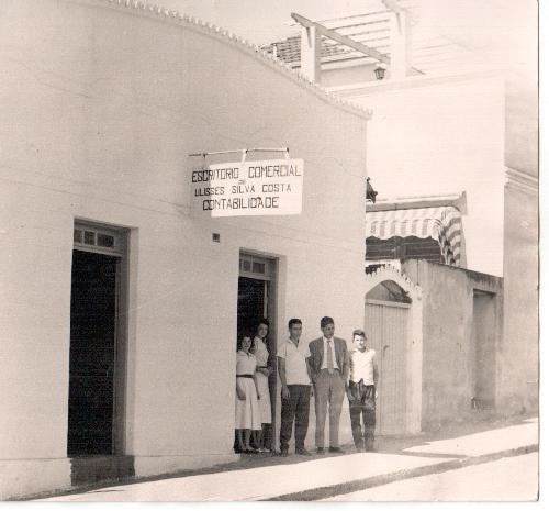 Defronte ao escritório de contabilidade de Ulisses Costa funcionários posam, na década de 60 em um momento de descontração. Ulisses Costa foi um contabor experiente, dedicado, competente e ético, por todos respeitado. Aqui constituiu família tornando-se uma pessoa muito querida, tendo falecido prematuramente vítima de acidente. Seu escritório localizava-se na rua Coronel Alcântara, entre o prédio do Miguelzinho (comércio e residência) e a residência de Ney Infante Vieira. (Acervo: Ulisses Aparecido da Silva Costa).