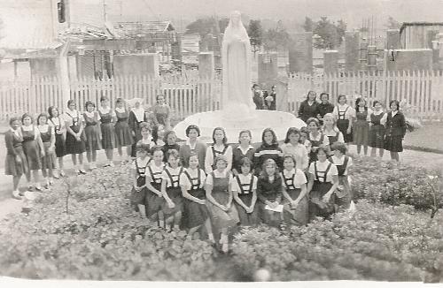 Alunas do Imaculada, no final dos anos 50 ou início dos anos 60, posam à frente das obras daquela que viria a ser a parte frontal do Colégio, na Avenida Getúlio Vargas. A imagem ainda hoje ali se encontra e a freira que as acompanha era a Irmã Inês. Registre-se o bonito uniforme que todas elas trajavam. (Acervo: Dyonizio Bandeira; intermediação por Vicente Estanislau Ribeiro, Vicentinho).