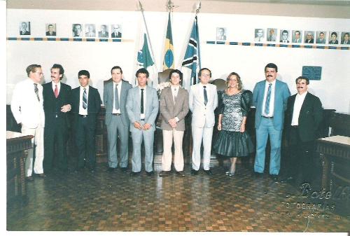 A Câmara de Vereadores eleita em 1988 para a legislatura de 89/92, assim ficou composta: pela ordem de votação e o respectivo partido: 1) 1086 votos (PMDB) -Diogo Augusto Biato Filho, 2) 711 votos (PMDB) –José Lázaro Boberg, 3) 663 votos (PMDB) Ângelo Tonet, 4) 493 votos (PTB) –Gláucio Pinheiro de Moura, 5) 479 votos (PTB) Manoel Vieira Santana, 6) 380 votos (PMDB) –Antonio Felício Demétrio Filho, 7) 369 votos (PSC) –Artur Luiz Paschoal, 8) 344 votos (PTB) –Maria das Graças Figueiredo Saad (primeira mulher eleita como vereadora em Jacarezinho) e 9) 287 (PTB) votos –Vicente Estanislau Ribeiro. A foto é da posse do dia 1º de janeiro de 1989 no plenário da Câmara Municipal. Da esquerda p/a direita: Dr. Adhemar Setti (prefeito eleito) e os vereadores, Pinheiro de Moura, Santana, Artur, Toninho Felício, Vicentinho, Boberg, Graça, Diogo e o Tonet. (Acervo e texto: Vicente Estanislau Ribeiro, Vicentinho).