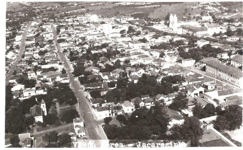 Da mesma data da foto anterior (anos 60) uma nova vista aérea de Jacarezinho, desta feita de outro ângulo, vendo-se bem à direita a rua Paraná e seguindo em direção á esquerda a rua Costa Júnior e a rua D. Fernando Tadei.